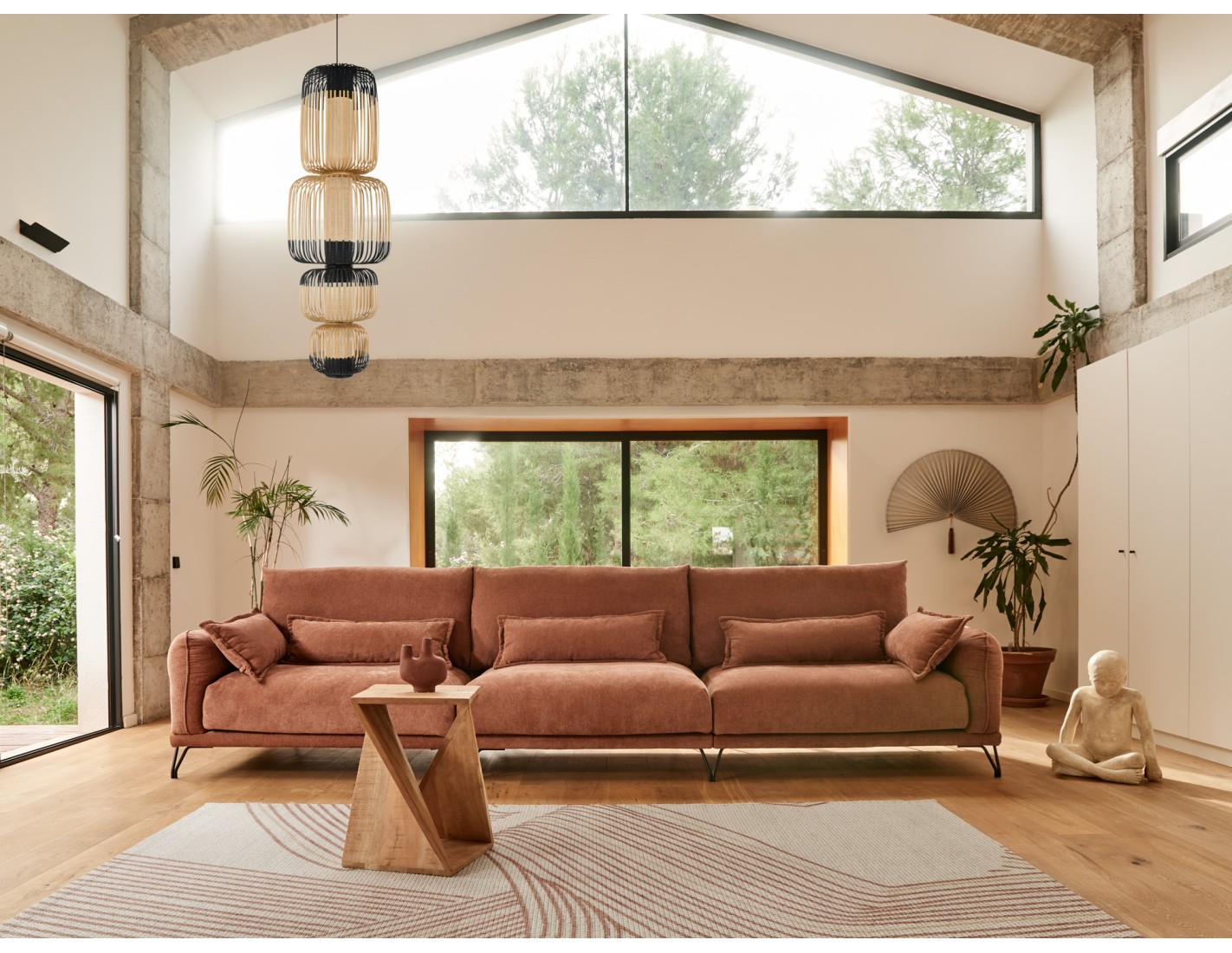 Cada aspecto de su diseño ha sido trabajado con dedicación, desde la elección minuciosa de materiales como la espuma de poliuretano Acofoam y el relleno de plumón sintético, hasta las elegantes patas metálicas de gran altura que se integran perfectamente en el conjunto, aportando un toque moderno y sofisticado.