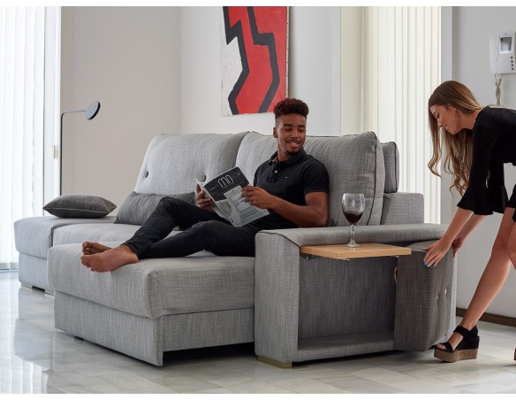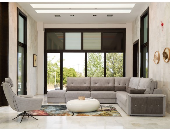 Enzo, un sofá exclusivo de Acomodel Tapizados, te brinda la elección entre el sistema deslizante plus arcón (Eléctrico) y el sistema fijo arcón, permitiéndote personalizar la composición perfecta para tu salón.