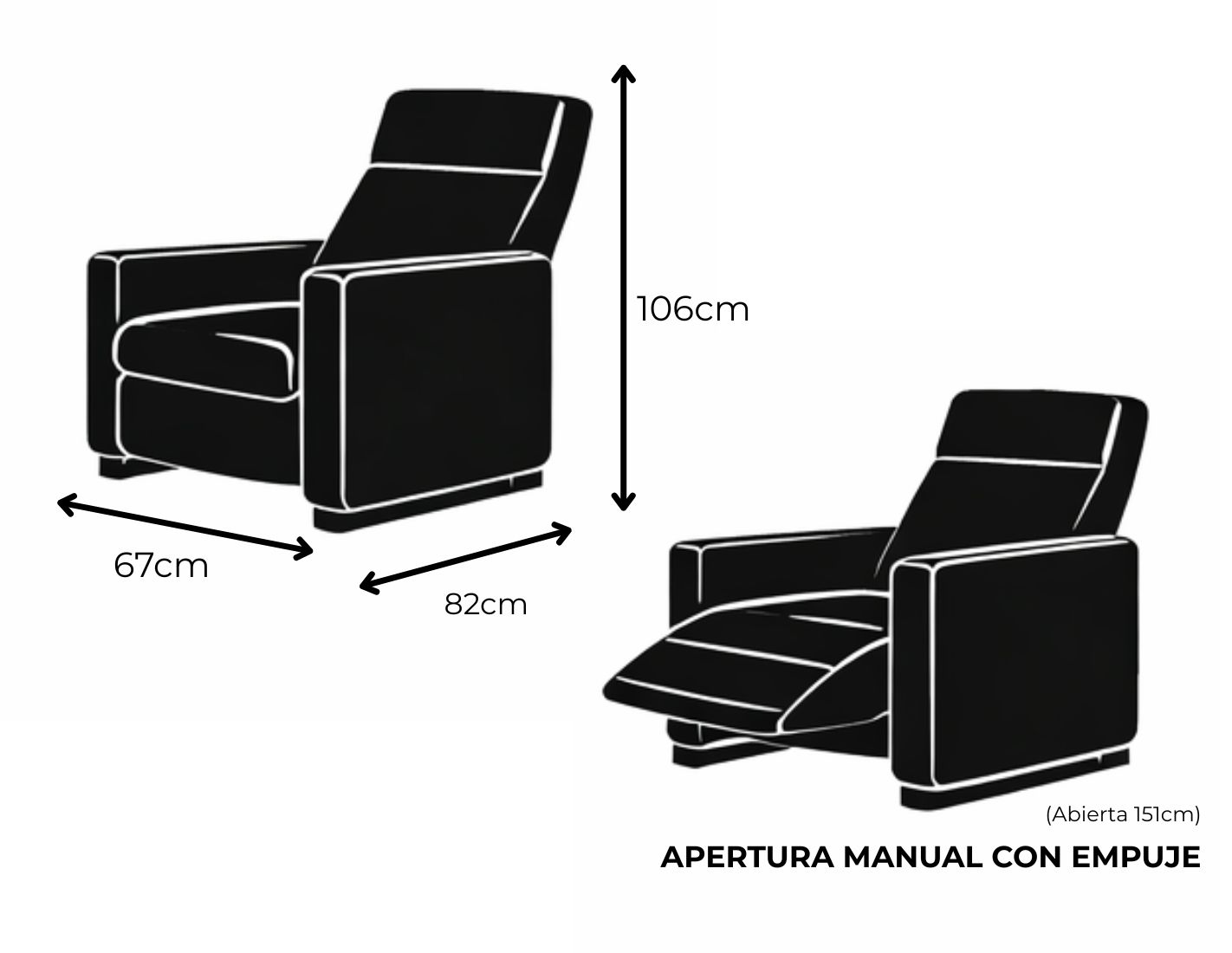 El sillón relax Blue cuenta con unas medidas aproximadas de 69 cm de ancho, 90 cm de fondo cerrado y 162 cm de fondo totalmente reclinado, ofreciendo el espacio perfecto para disfrutar de un descanso cómodo y relajante.